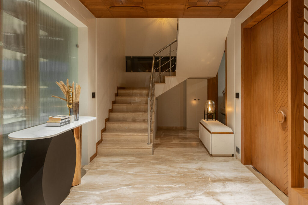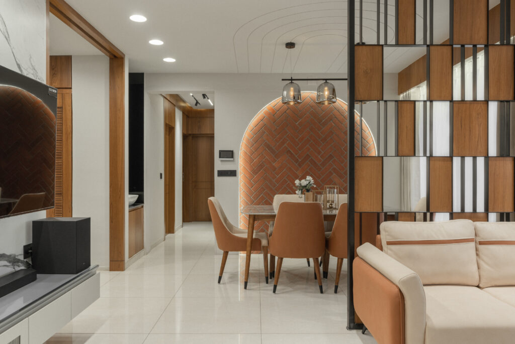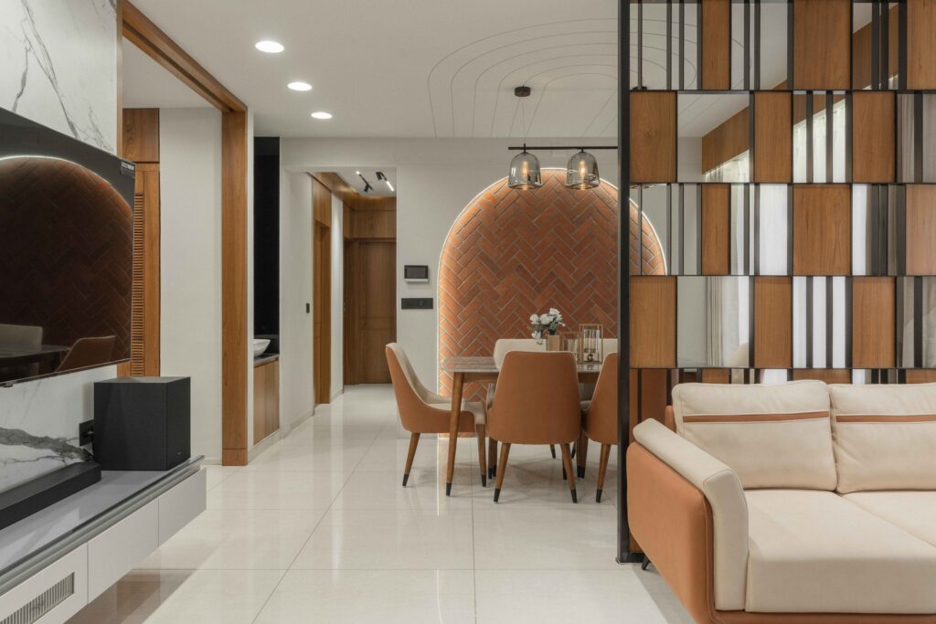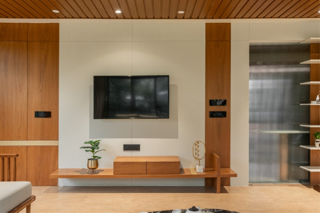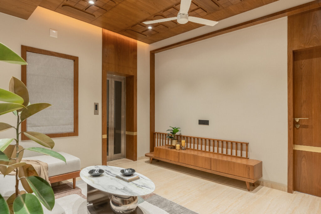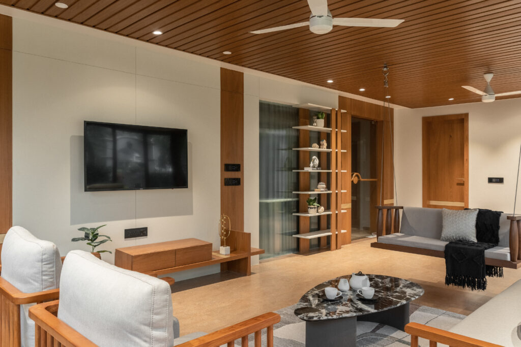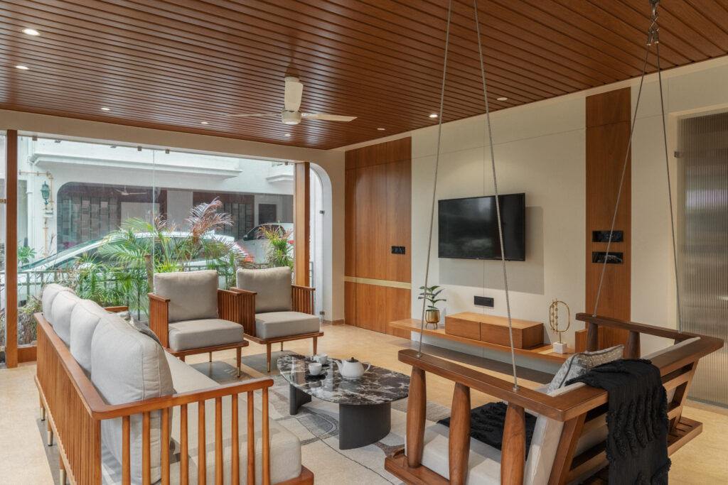 This project brings together warm wood textures, soft neutrals, and clean modern lines to create a living space that feels open, grounded, and effortlessly comfortable. The layout is planned to encourage easy movement and conversation, while custom-crafted elements like the suspended wooden swing become the focal feature. Natural light, minimal decor, and balanced proportions keep the room uncluttered, giving it a calm, welcoming personality that still feels premium and thoughtfully designed.