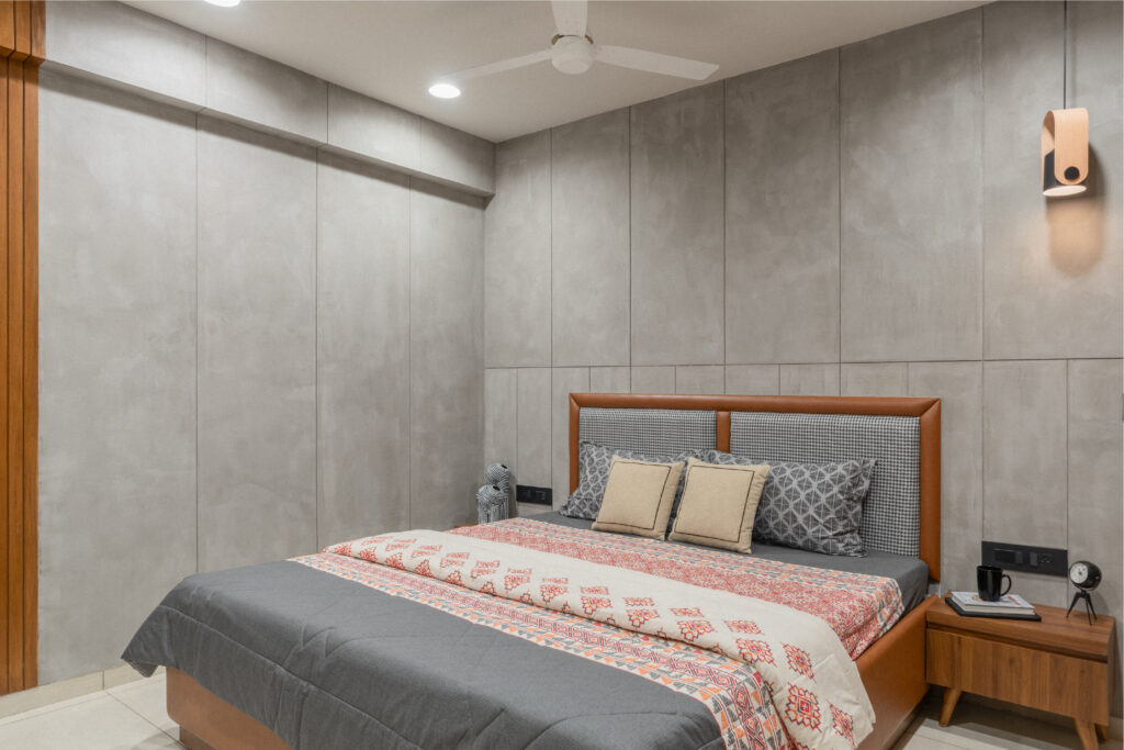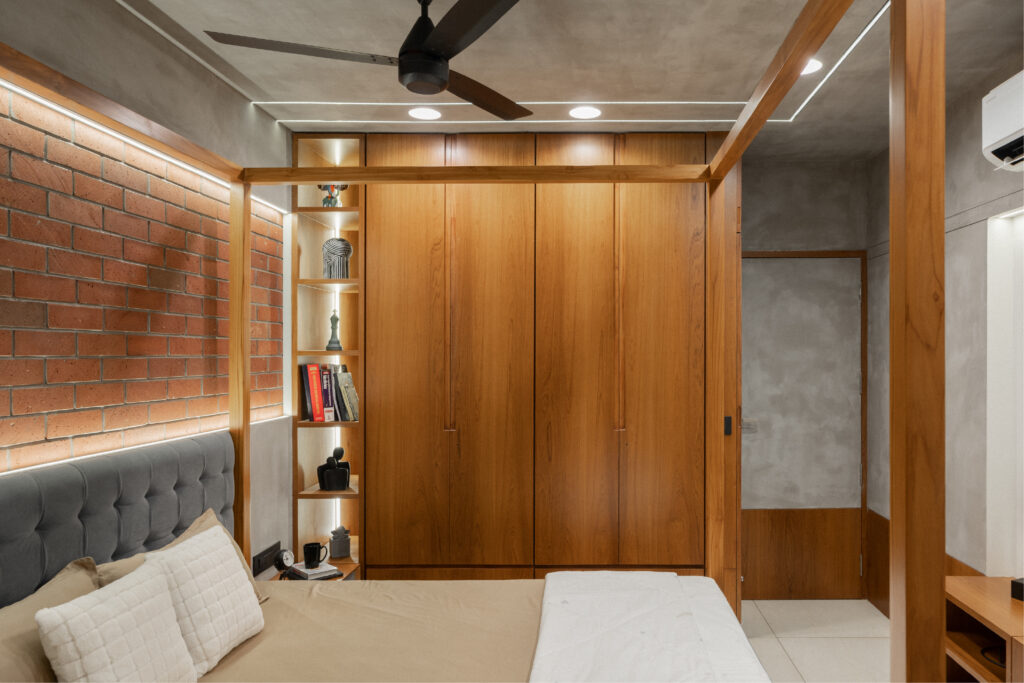 This bedroom project mixes raw and refined elements to create a space that feels warm, grounded, and intentionally crafted. The exposed brick wall adds texture and character, balanced by smooth concrete finishes and soft grey drapery that keep the room calm and modern. Warm wooden frames and furniture pieces tie everything together, giving the space a natural warmth without clutter.Β